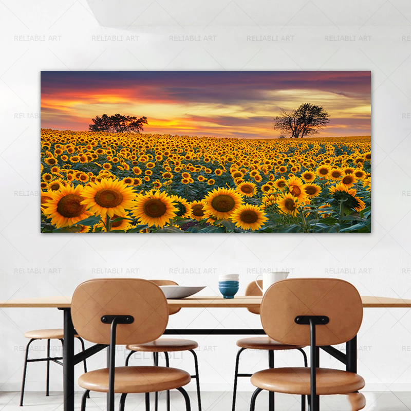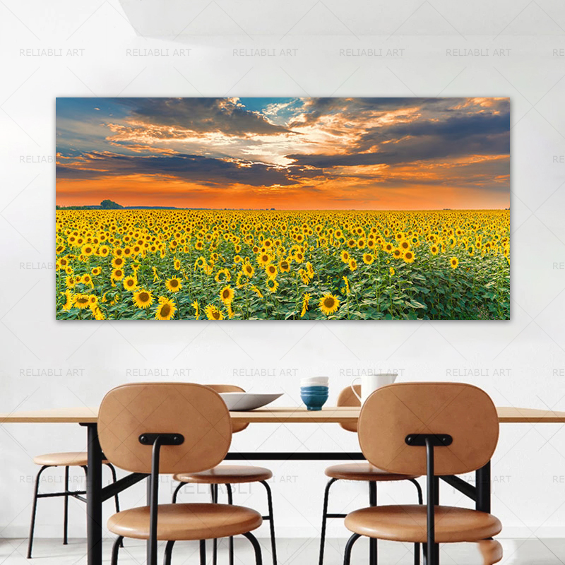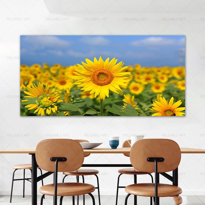 Brighten up your home with this beautiful canvas print of sunflower fields. This Sunflower Fields Canvas features a stunning photograph of a vast field of yellow sunflowers under a blue sky, capturing the natural beauty and joy of these cheerful flowers. The canvas is made of high-quality material and stretched over a wooden frame, ready to hang on your wall. Whether you want to add some color and warmth to your living room, bedroom, kitchen, or office, this canvas print will bring a touch of sunshine to any space. Sunflowers are also symbols of happiness, optimism, and loyalty, making this canvas a perfect gift for your loved ones. Order yours today and enjoy the view of sunflower fields every day!