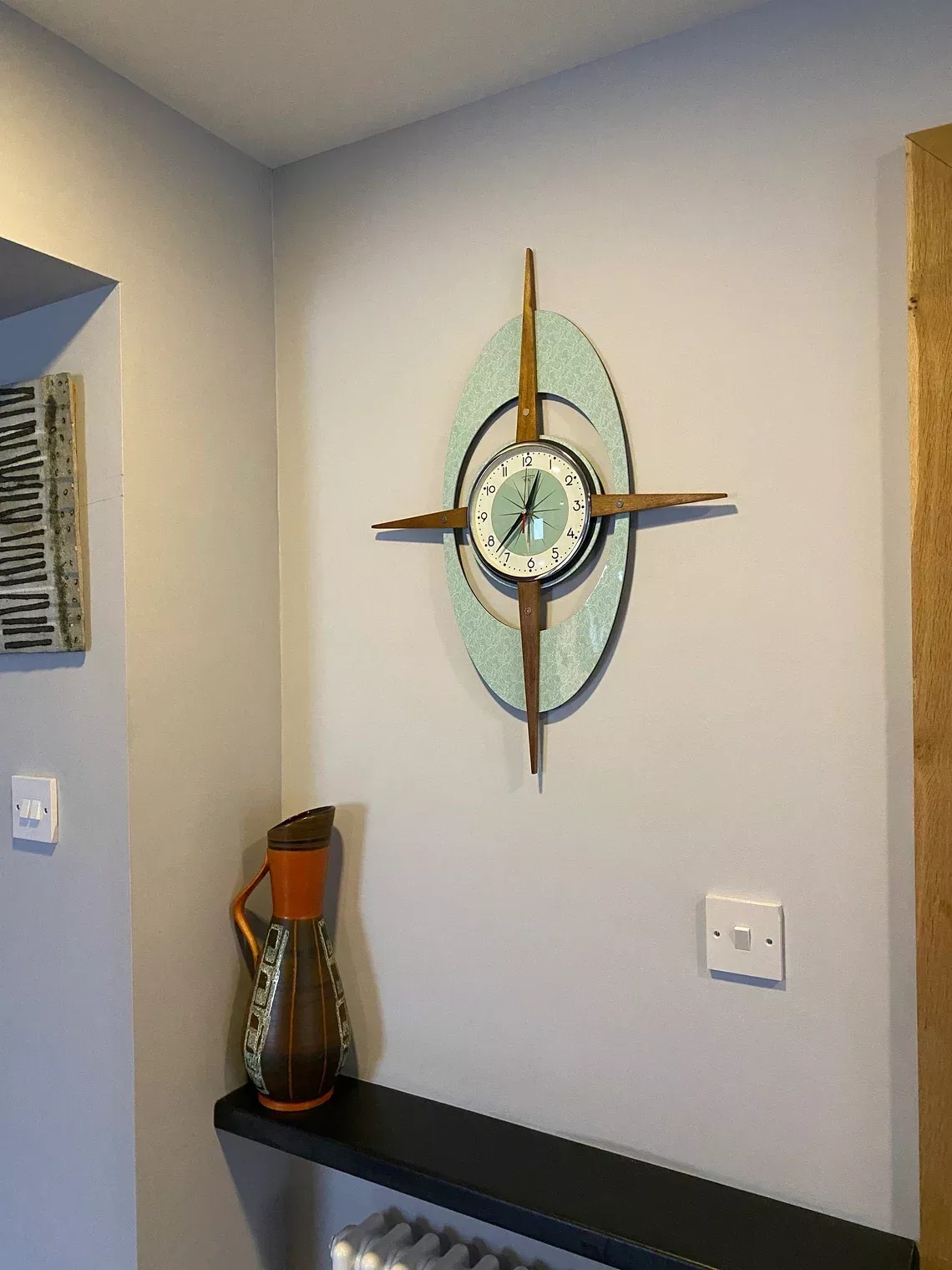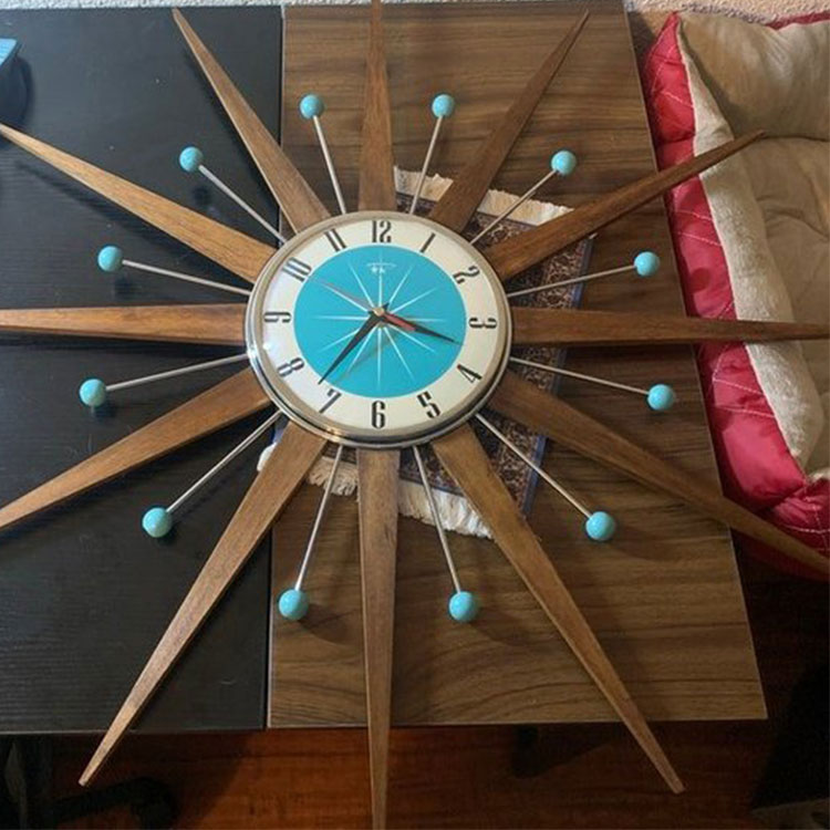 Like the nostalgic style but haven’t found the right decorations? Vintage mid century wall clock is for you. The beautiful appearance, gorgeous geometric design, modern style, and superb craftsmanship will surely become bright scenery in your home. It is made of excellent material with a cast iron frame, gold spraying process, solid welding, durability, no ugly cords, long service life, and long-term use without fading. The clock runs silently to prevent annoying ticking sounds and provide a quiet sleeping and working environment. Try adding a Starburst-style clock to your home or office! Buy now!